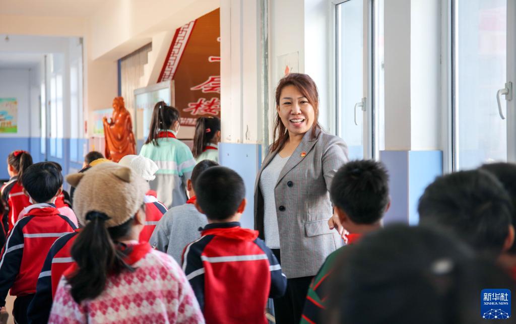 11月8日,在通遼市科爾沁區紅星中心小學(xué),趙穎慧引導學(xué)生們去做課間操。