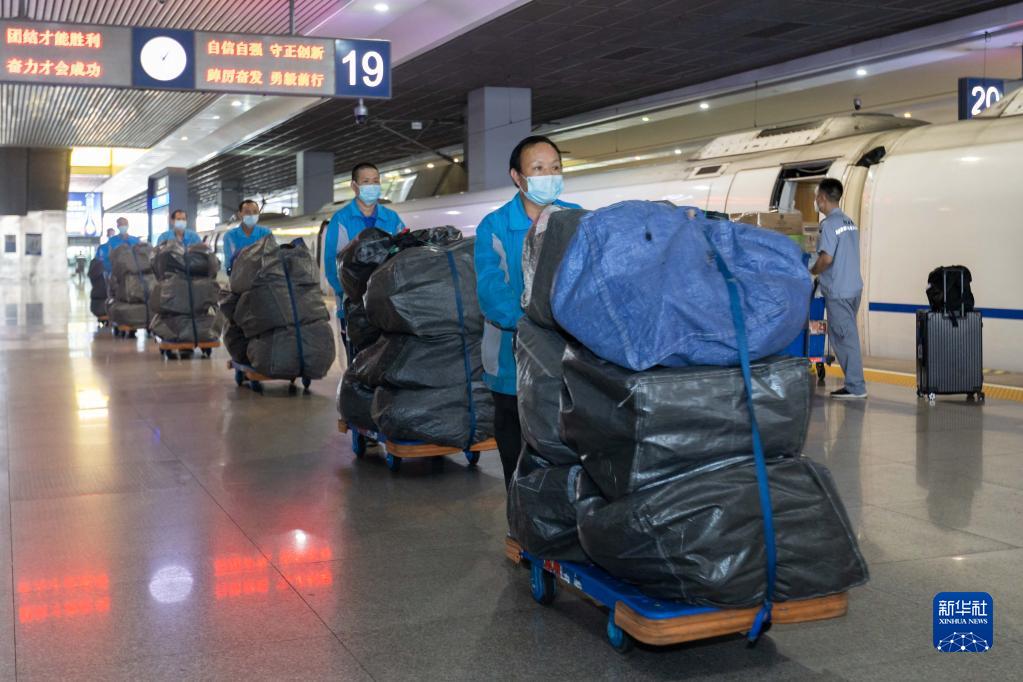 11月11日,在上海虹橋站,工作人員將打包好的貨物運送到集散點(diǎn)。為應對 “雙11”物流高峰,中國鐵路上海局集團公司將部分載客高鐵動(dòng)車(chē)組列車(chē)用于快件運輸。