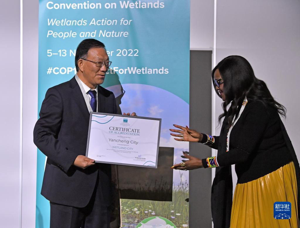 11月10日,在瑞士日內瓦,《濕地公約》秘書(shū)長(cháng)蒙巴(右)為中國江蘇鹽城頒發(fā)“國際濕地城市”認證證書(shū)。