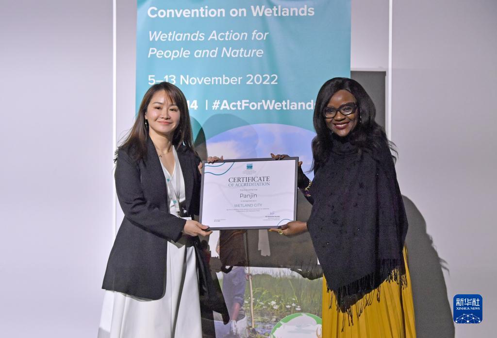 11月10日,在瑞士日內瓦,《濕地公約》秘書(shū)長(cháng)蒙巴(右)為中國遼寧盤(pán)錦頒發(fā)“國際濕地城市”認證證書(shū)。
