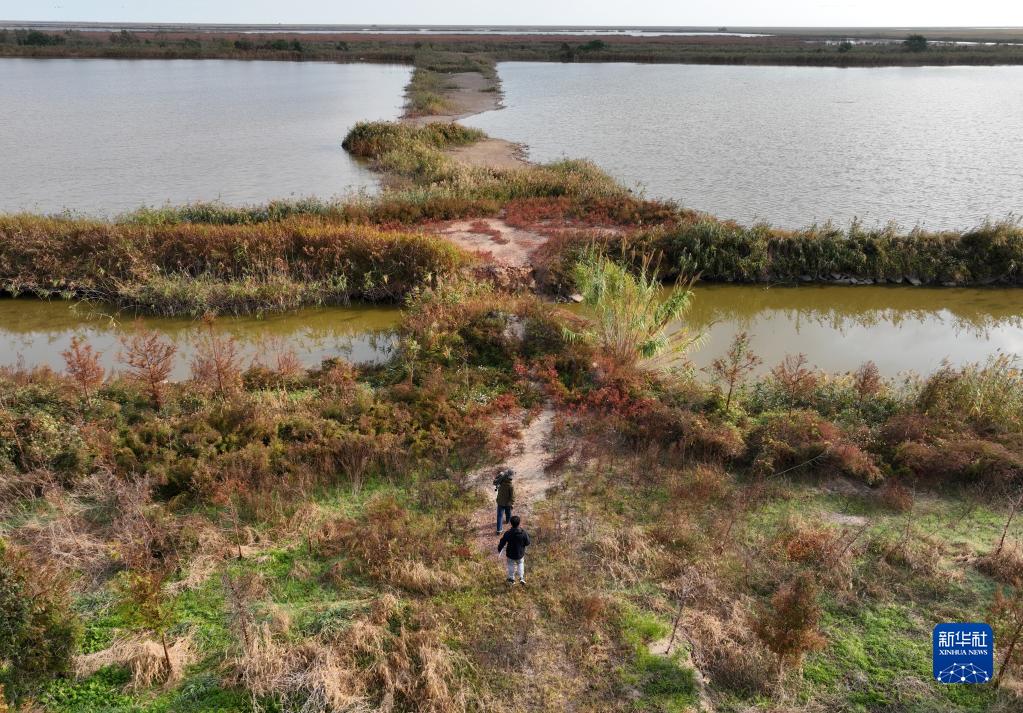 保護區科研人員李征浩(下)和趙永強前往目的地,開(kāi)展鳥(niǎo)類(lèi)多樣性調查和監測(11月8日攝,無(wú)人機照片)。