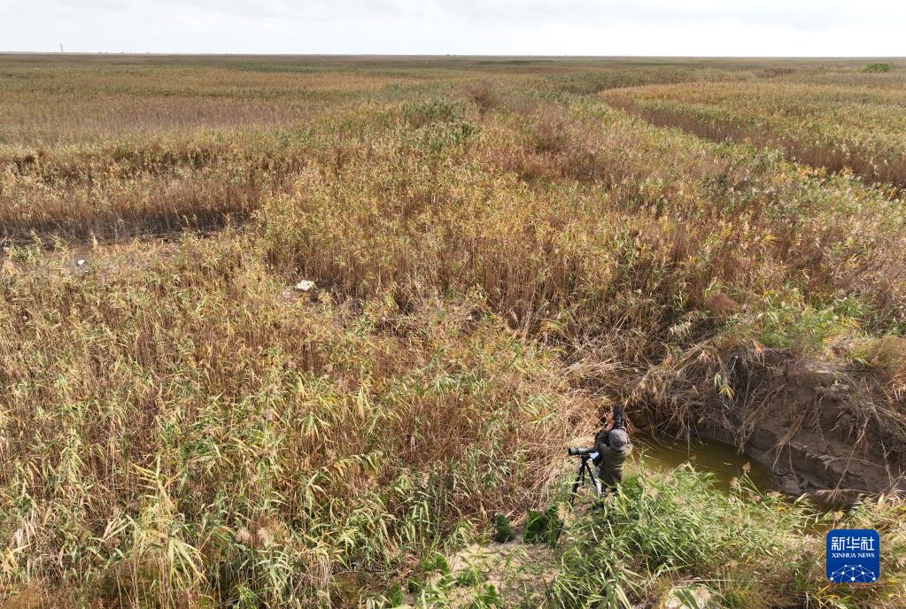 保護區科研人員李征浩和趙永強(下)在開(kāi)展鳥(niǎo)類(lèi)多樣性調查和監測(11月8日攝,無(wú)人機照片)。