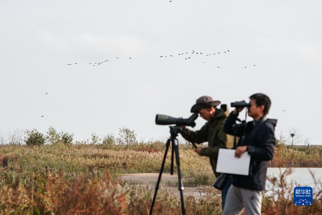 保護區科研人員趙永強(左)、李征浩在濕地調查(11月8日攝)。