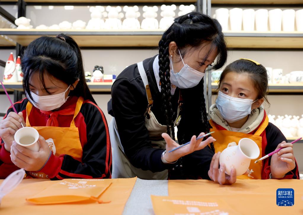 11月11日,江蘇省徐州市漢王鎮紫山村春泥陶藝的老師(中)在陶藝教室向學(xué)生講解彩陶繪陶的有關(guān)知識。