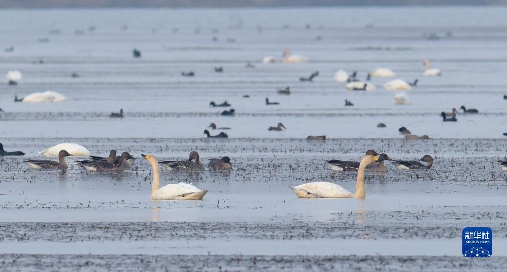 11月11日,天鵝等鳥(niǎo)類(lèi)在廬江縣黃陂湖棲息。