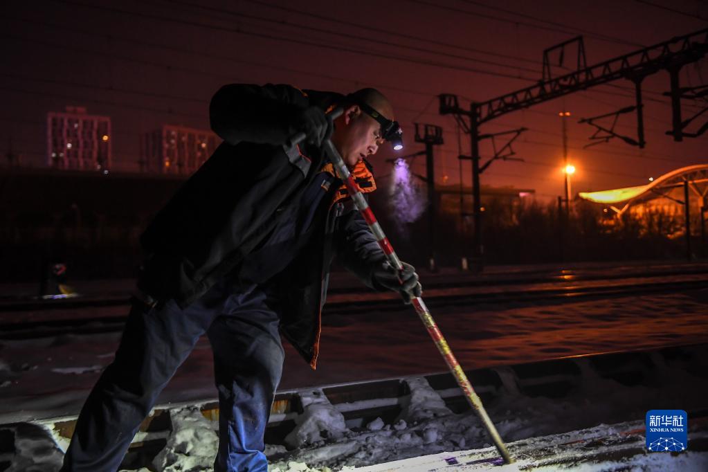 11月13日,在長(cháng)春火車(chē)站,中國鐵路沈陽(yáng)局集團有限公司長(cháng)春高鐵基礎設施段工作人員清理鐵軌縫隙內的冰雪。