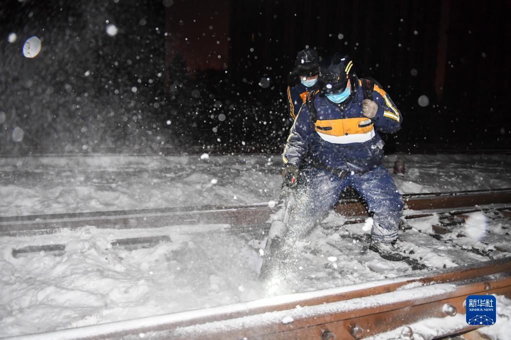 11月13日,在長(cháng)春火車(chē)站,中國鐵路沈陽(yáng)局集團有限公司長(cháng)春站工作人員清理鐵軌上的積雪。