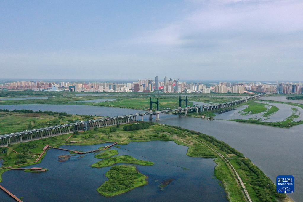 位于哈爾濱市的群力外灘生態(tài)濕地公園(6月4日攝,無(wú)人機照片)。