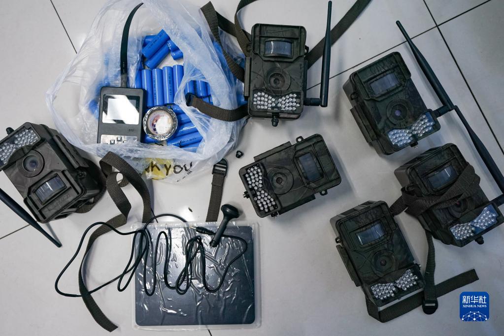 這是用于野生動(dòng)物監測的紅外相機、電池、太陽(yáng)能板等設備(11月8日攝)。