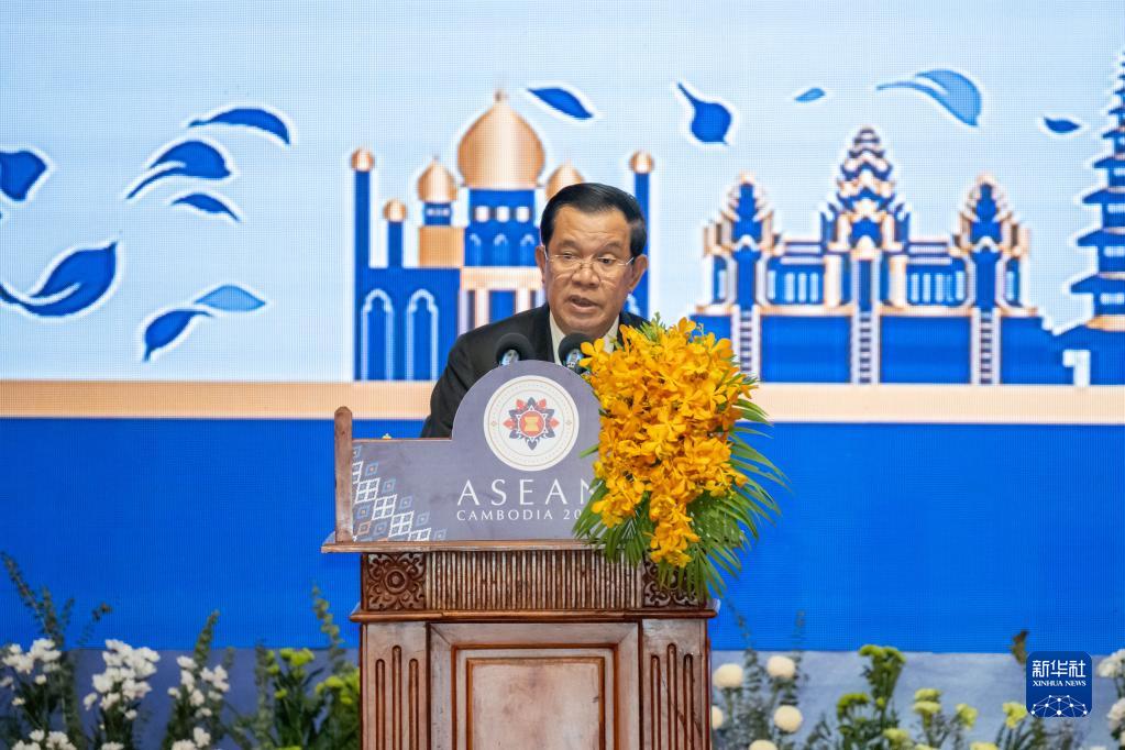 11月13日,柬埔寨首相洪森在柬埔寨首都金邊舉行的閉幕式上致辭。