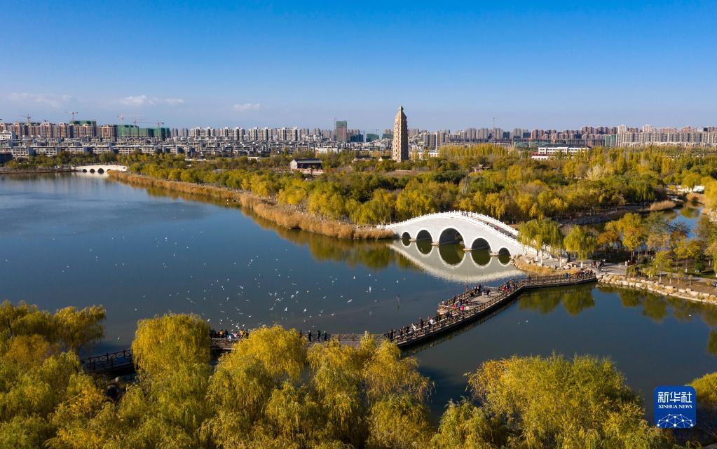 這是2019年11月2日拍攝的寧夏銀川市海寶公園秋景(無(wú)人機照片)。
