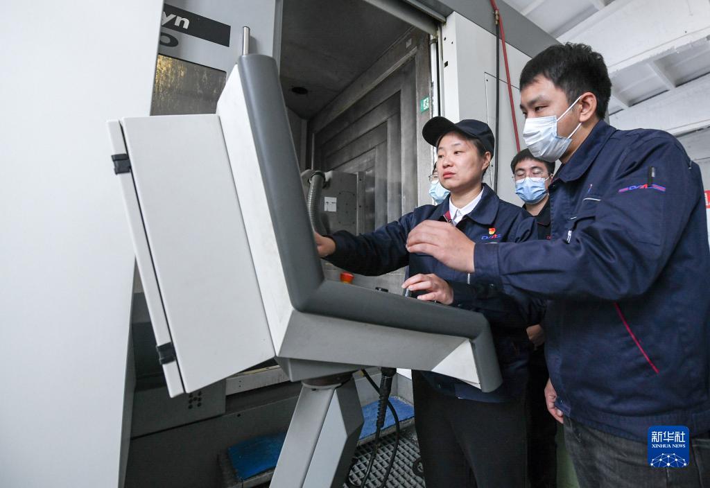 在哈爾濱東安汽車(chē)動(dòng)力股份有限公司增程動(dòng)力系統研究院加工中心,苗秀(左)與工作室成員共同操作機床(11月15日攝)。