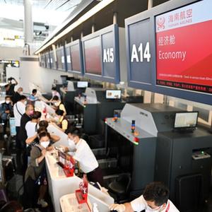 11月16日,準備乘坐海航班機前往香港的旅客在??诿捞m國際機場(chǎng)辦理登機手續。