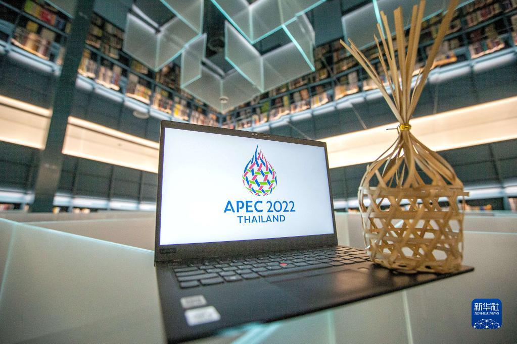 這是11月5日在泰國曼谷朱拉隆功大學(xué)拍攝的2022年亞太經(jīng)合組織會(huì )議會(huì )標和泰國傳統竹編器皿“插隆”。