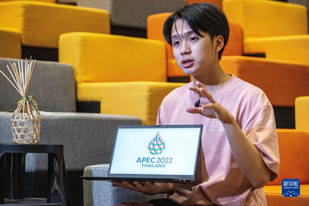 11月5日,在泰國曼谷朱拉隆功大學(xué),會(huì )徽設計者查瓦農·翁特拉庫容介紹自己的設計理念。