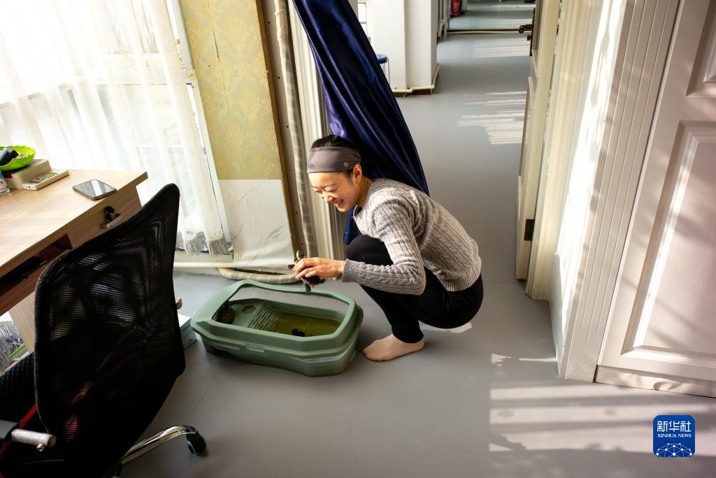 11月8日,在北京家中的舞蹈教室,寵物龜從龜缸里爬了出來(lái),趙蘊輝捉住這個(gè)“頑皮”的家伙,開(kāi)心地笑了起來(lái)。 新華社記者 劉金海 攝