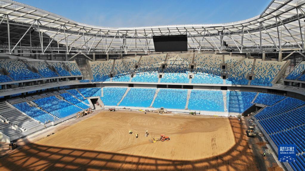 青島青春足球場(chǎng)內場(chǎng)在進(jìn)行場(chǎng)地平整施工(11月16日攝,無(wú)人機照片)。