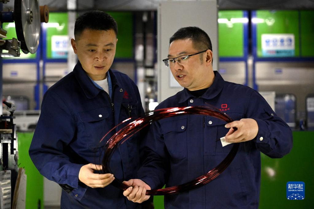 11月16日,在位于安徽省銅陵市的銅陵精達特種電磁線(xiàn)股份有限公司生產(chǎn)車(chē)間,蘇保信(右)與技術(shù)工人交流電磁線(xiàn)的生產(chǎn)情況。