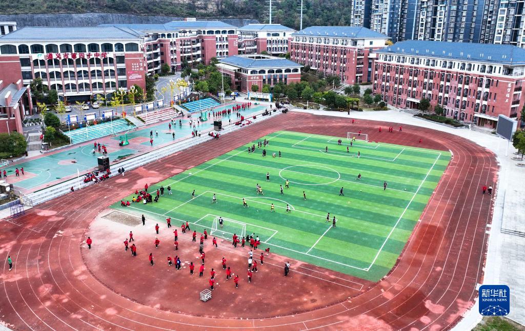 11月17日,學(xué)生在貴州省遵義市第四十中學(xué)練習足球(無(wú)人機照片)。