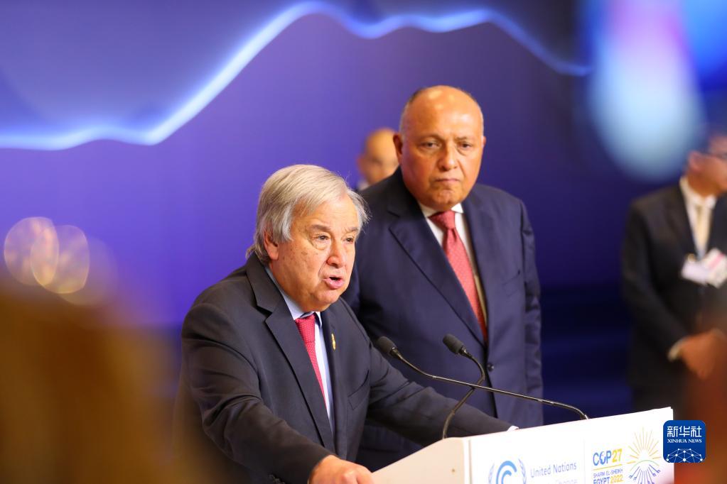 11月17日,聯(lián)合國秘書(shū)長(cháng)古特雷斯(左)在埃及沙姆沙伊赫舉行的記者會(huì )上發(fā)言。