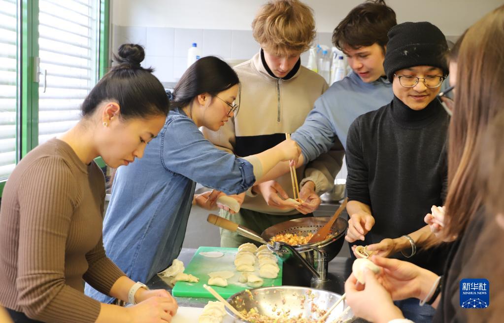 11月17日,在斯洛文尼亞采列市,孔子課堂中國佳肴工作坊的師生一起包餃子。