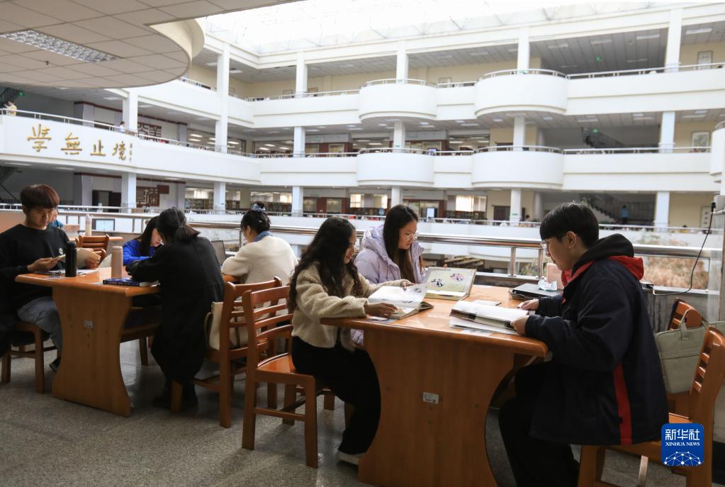 11月16日,李文龍(右一)、明亮(右二)和白書(shū)晴(右三)在圖書(shū)館查閱京劇相關(guān)資料書(shū)籍。