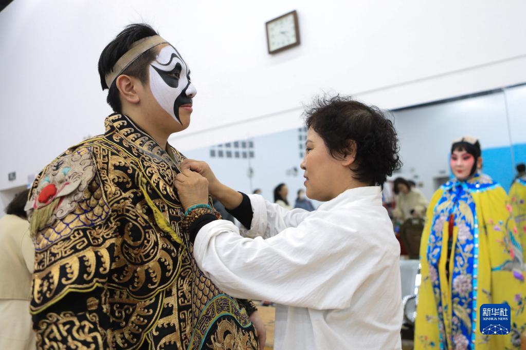 11月14日,沈陽(yáng)京劇院老師為李文龍(左)穿戲服。