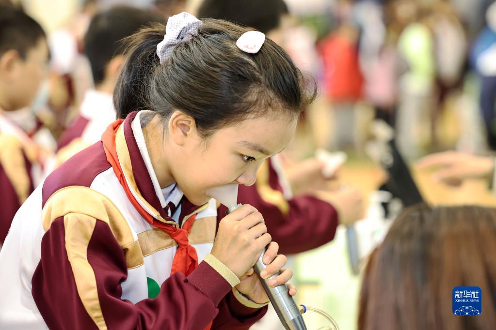 11月18日,天津市和平區萬(wàn)全小學(xué)學(xué)生在《國家學(xué)生體質(zhì)健康標準》測試中進(jìn)行肺活量測試。