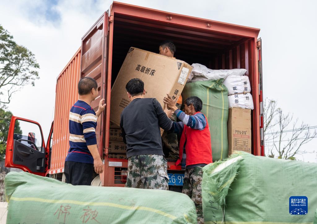 11月19日,在紅河縣浪堤鎮安品村,護林員和志愿者在搬運救災物資。