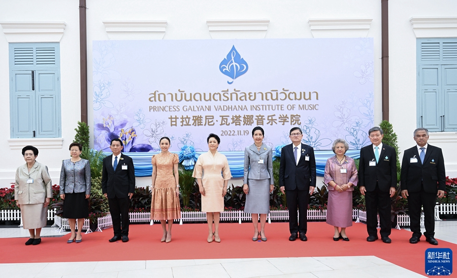當地時(shí)間11月19日上午,國家主席習近平夫人彭麗媛在泰國總理夫人娜拉蓬陪同下參觀(guān)甘拉雅尼音樂(lè )學(xué)院。這是彭麗媛與娜拉蓬等合影。