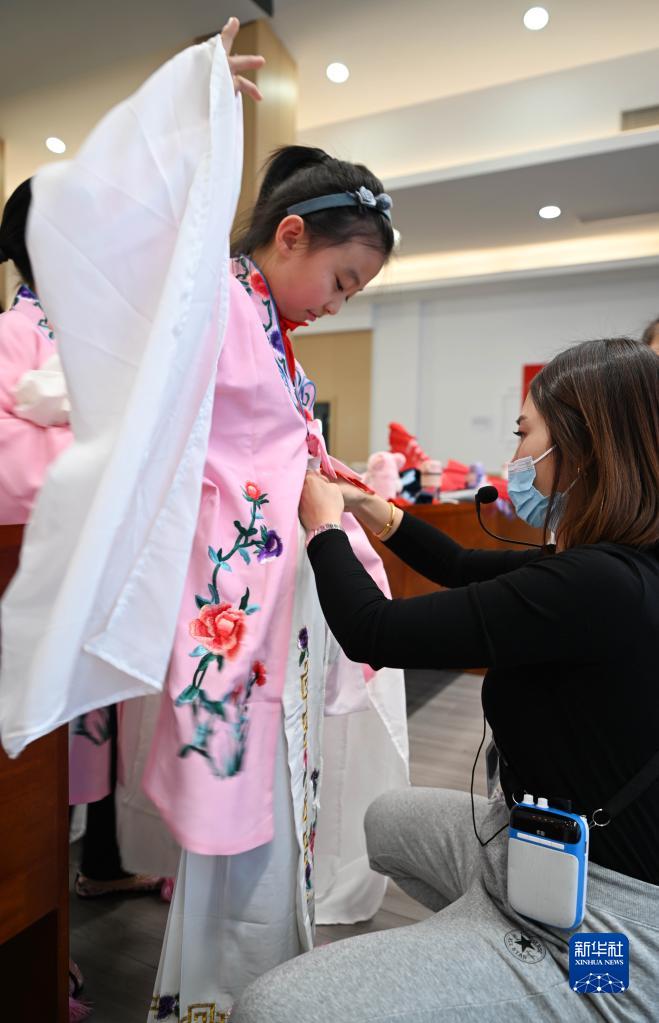 在天津師范大學(xué)第三附屬小學(xué),老師給學(xué)生整理戲服(11月15日攝)。