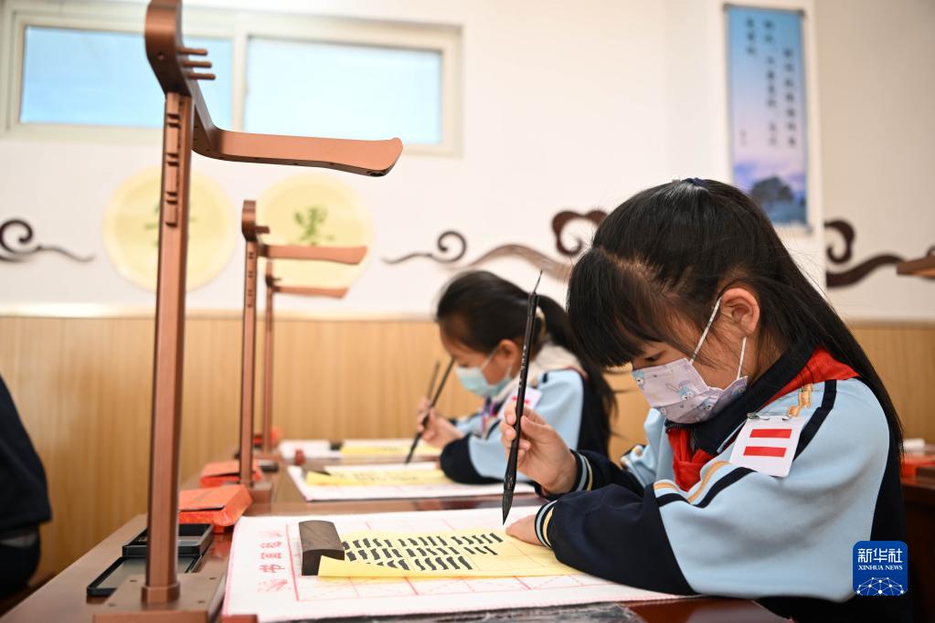 天津師范大學(xué)第三附屬小學(xué)的學(xué)生在練習書(shū)法(11月15日攝)。