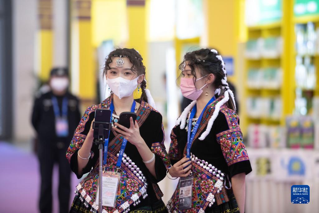11月19日,兩名身著(zhù)民族服裝的工作人員在南博會(huì )現場(chǎng)進(jìn)行直播。