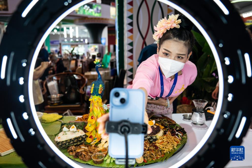 11月19日,南博會(huì )德宏展區的參展商在直播推介特色商品。