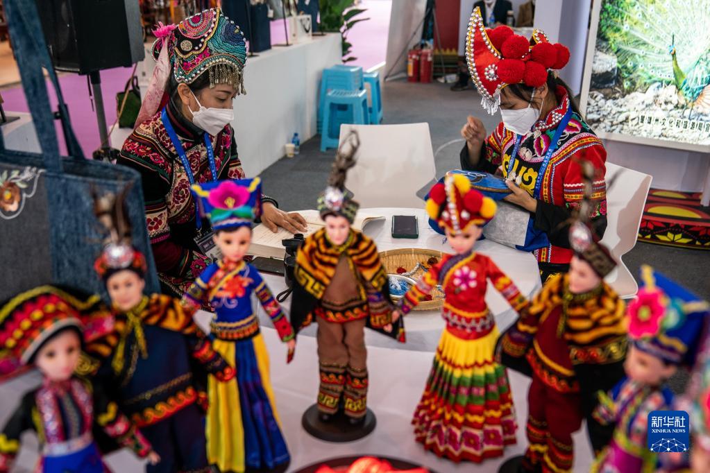 11月19日,南博會(huì )楚雄展區的參展商在現場(chǎng)展示彝繡技藝。