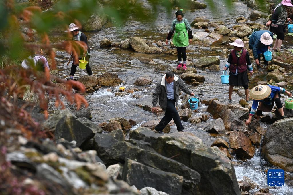 11月19日,在廣西融水苗族自治縣桿洞鄉黨鳩村,河長(cháng)梁成張(前中)帶著(zhù)村民清理烏嘎河垃圾。