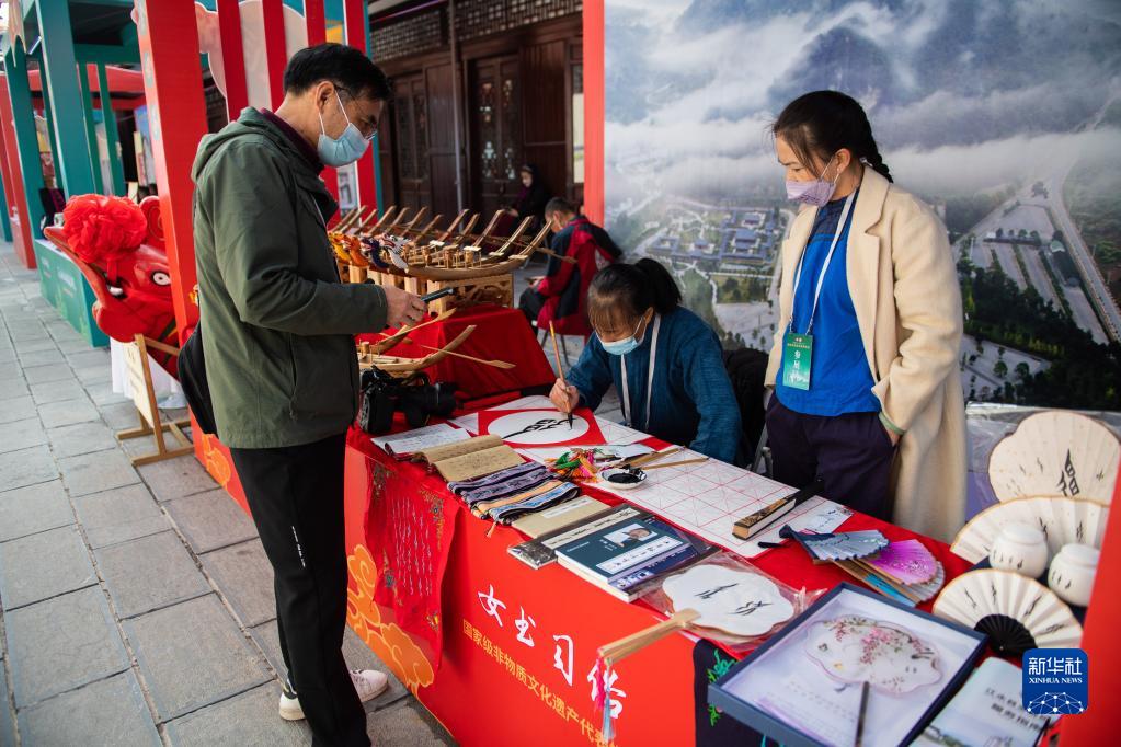 11月19日,非遺傳承人在張家界大庸古城湖南首屆非遺博覽會(huì )現場(chǎng)展示女書(shū)習俗。