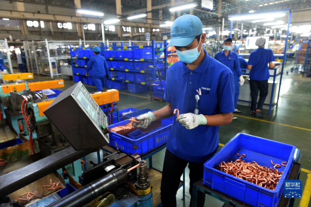 11月8日,在位于泰國羅勇府的泰中羅勇工業(yè)園,工人在盾安金屬(泰國)有限公司生產(chǎn)線(xiàn)上工作。
