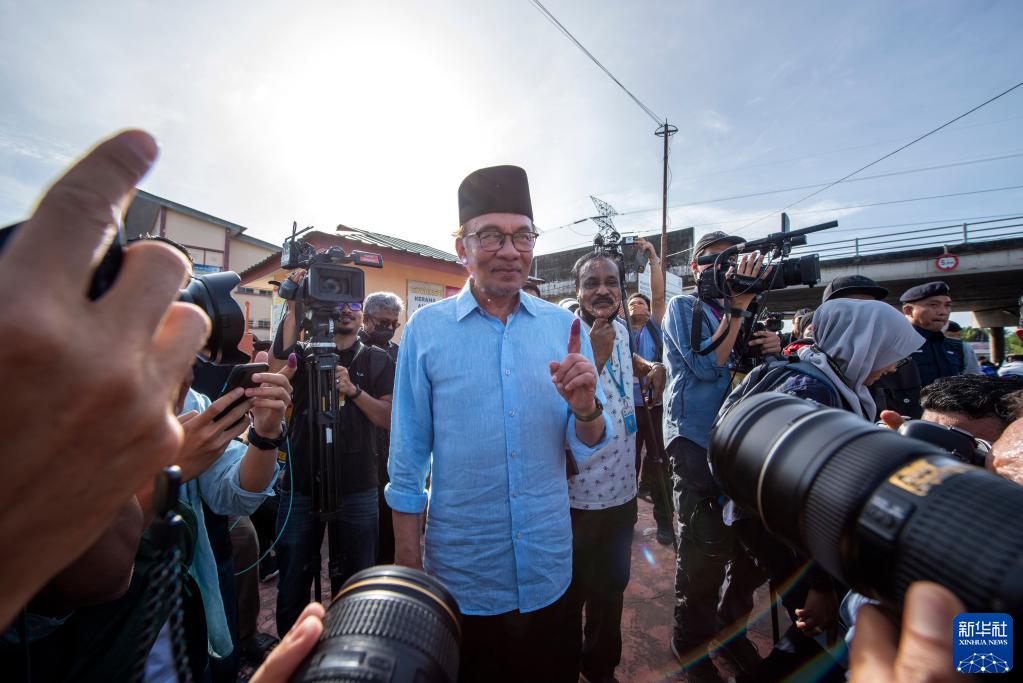 11月19日,在馬來(lái)西亞檳榔嶼州一處投票站,希望聯(lián)盟領(lǐng)袖安瓦爾在投票后展示手指。
