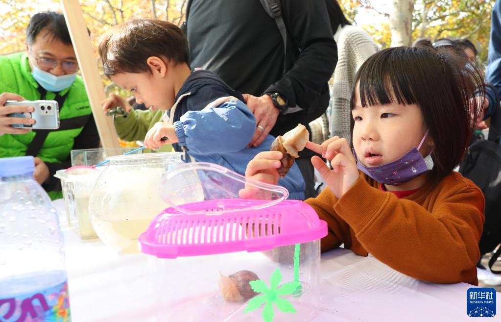 11月20日,小朋友在上海自然博物館外來(lái)入侵物種展示展位上觸摸一只非洲大蝸?;铙w。