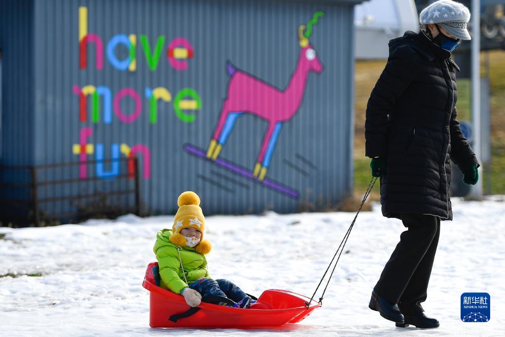 11月20日,在吉林市萬(wàn)科松花湖度假區,一名小朋友在雪地中玩雪橇車(chē)。