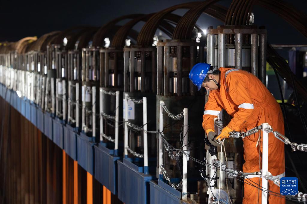 11月21日,在“奮力”輪打撈船上,施工人員在觀(guān)察古船上升情況。