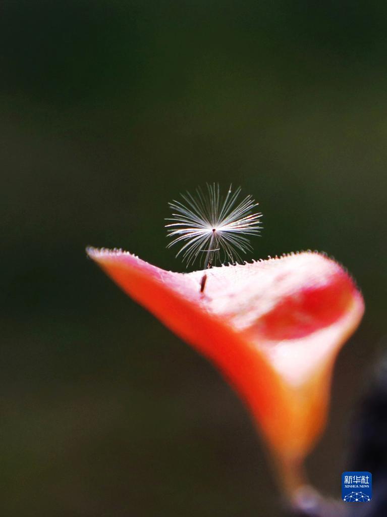 11月13日,在山東省滕州市西崗鎮,蒲公英種子和紅葉相映成趣。