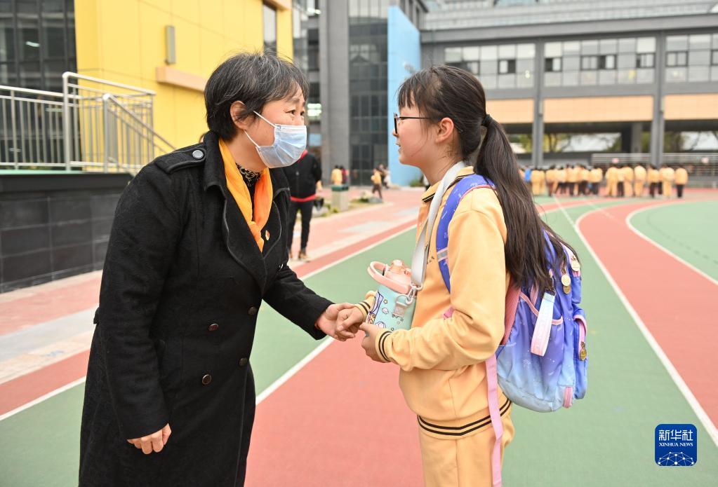 11月18日,在北京第二實(shí)驗小學(xué),蘆詠莉與學(xué)生握手交流。