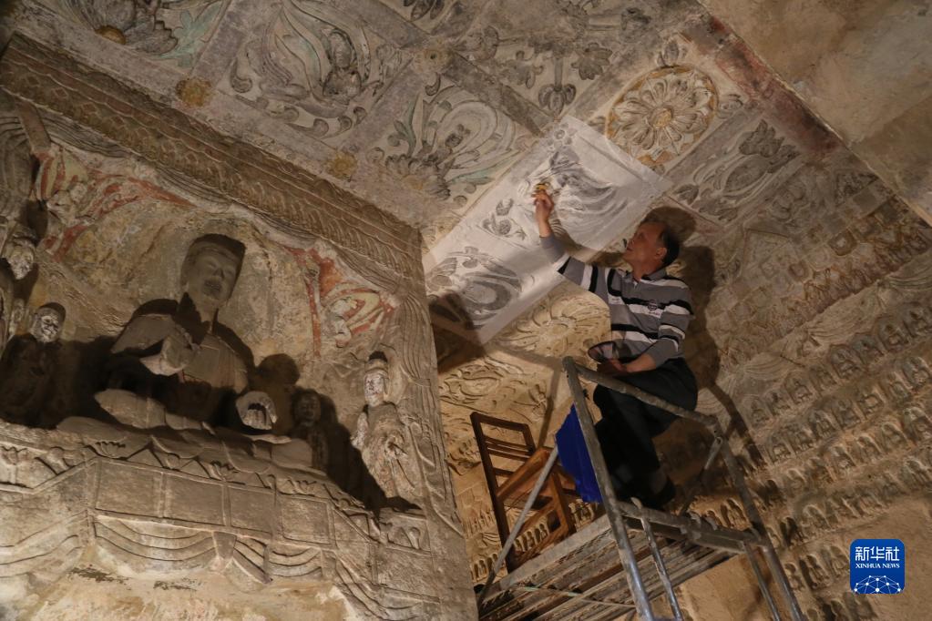 李仁清在鞏義石窟寺進(jìn)行拓?。ㄙY料照片)。