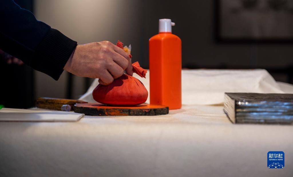 在鄭州商都遺址博物院臨時(shí)展廳里的體驗區,李仁清在備墨(11月17日攝)。