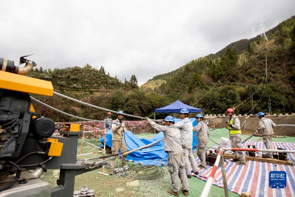 11月20日,安徽送變電工程有限公司施工人員在施工現場(chǎng)展放導線(xiàn)。
