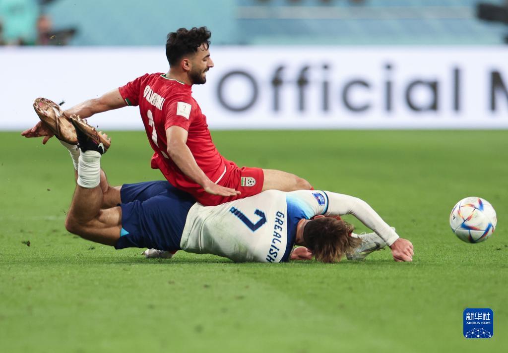 11月21日,伊朗隊球員穆哈拉米(上)與英格蘭隊球員格拉利什拼搶。