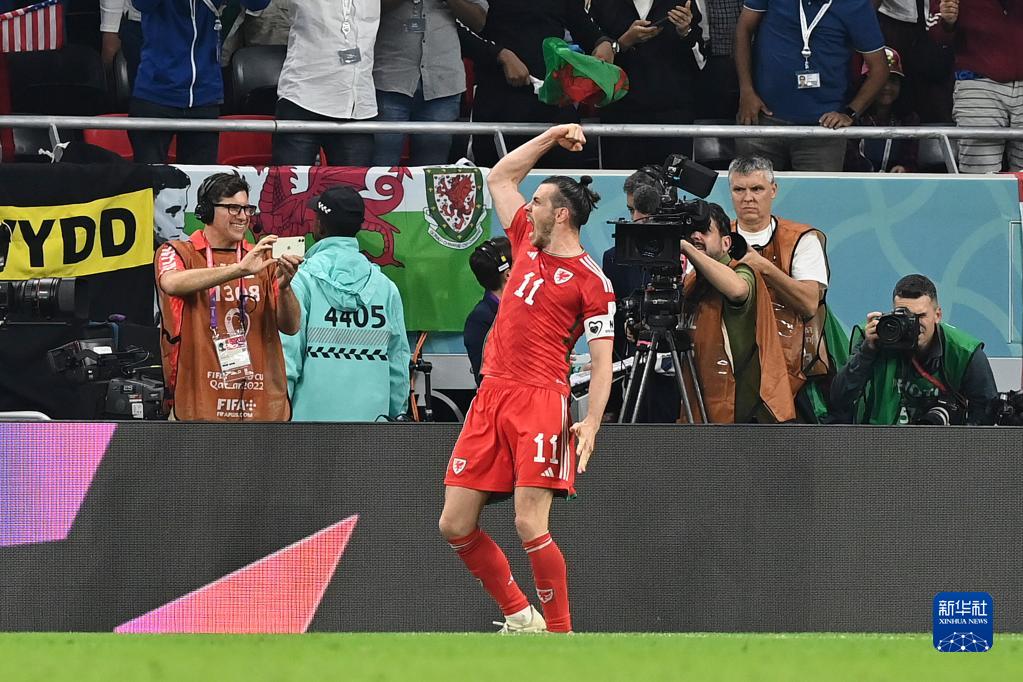 11月21日,威爾士隊球員加雷斯·貝爾(前)在比賽中慶祝進(jìn)球。