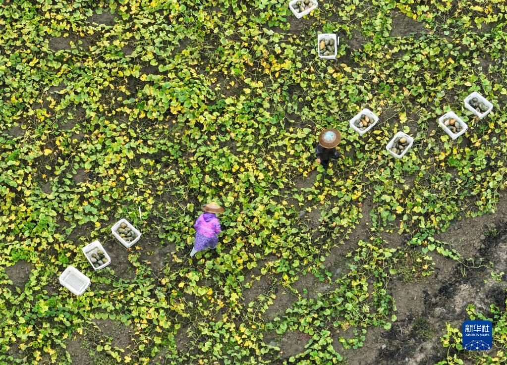 11月22日,湖南省永州市道縣一蔬菜基地,農戶(hù)在采收南瓜(無(wú)人機照片)。